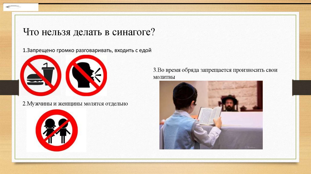 Что нельзя делать в синагоге?1.Запрещено громко разговаривать, входить с едой