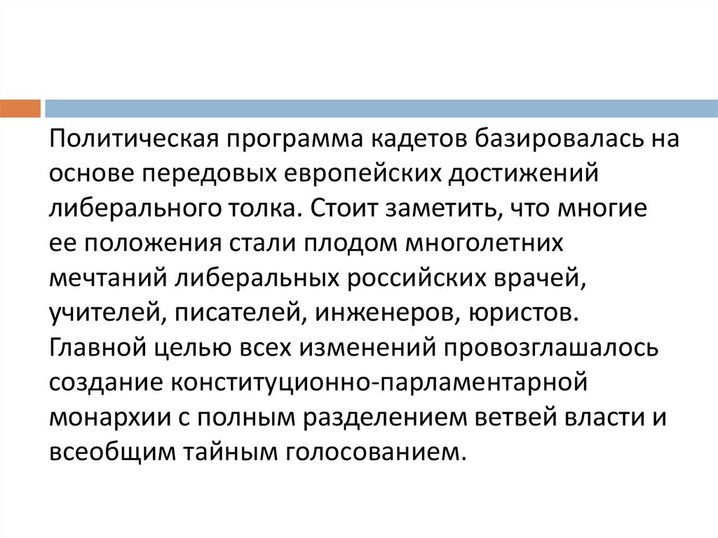 Политическая программа кадетов базировалась наоснове передовых европейских достижений