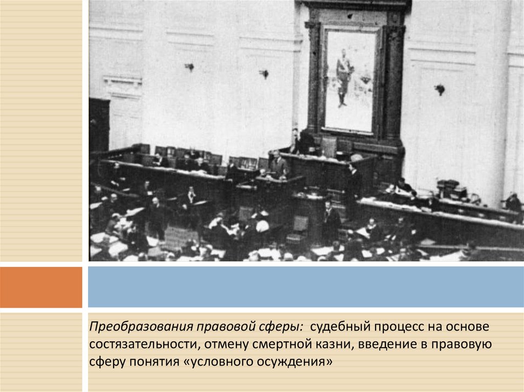 Преобразования правовой сферы: судебный процесс на основесостязательности, отмену смертной казни, введение в правовую