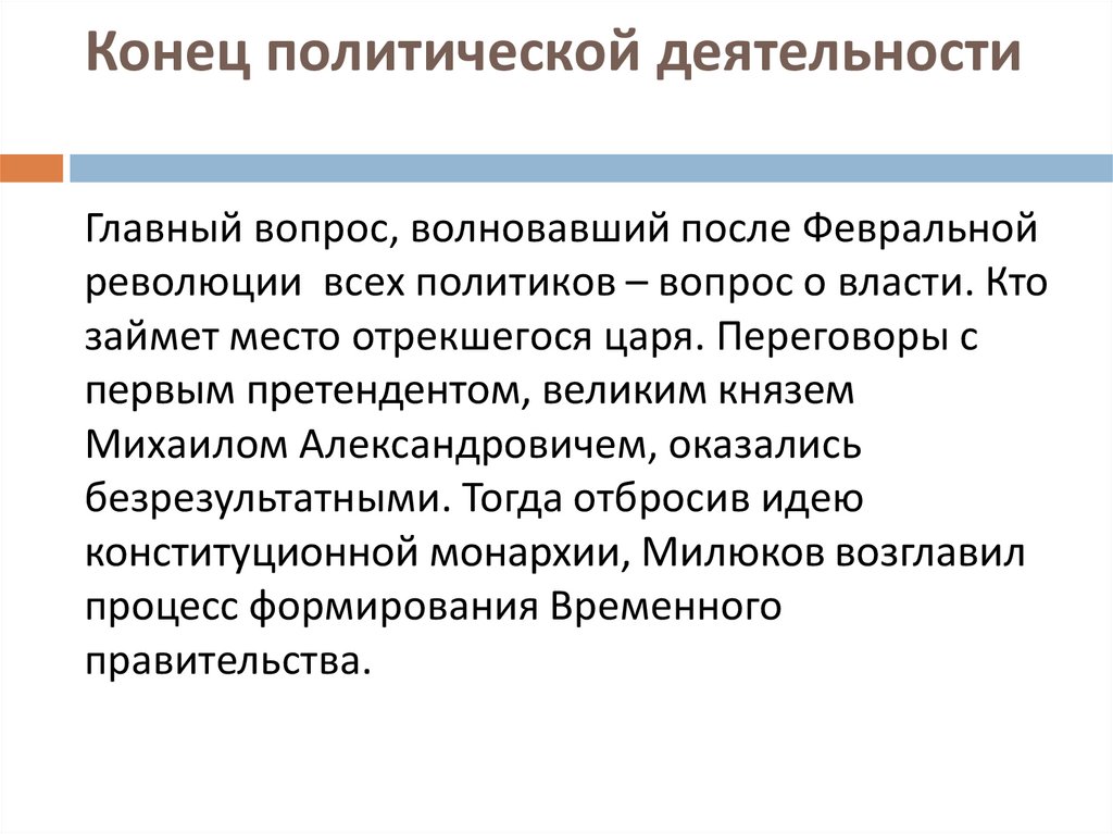 Конец политической деятельностиГлавный вопрос, волновавший после Февральной