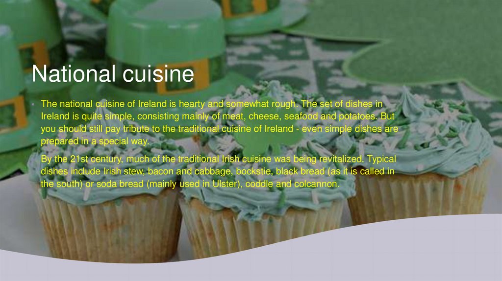 National cuisineThe national cuisine of Ireland is hearty and somewhat rough. The set of dishes in