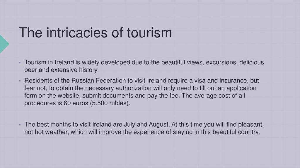 The intricacies of tourismTourism in Ireland is widely developed due to the beautiful views, excursions, delicious