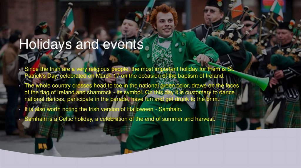 Holidays and eventsSince the Irish are a very religious people, the most important holiday for them is St.