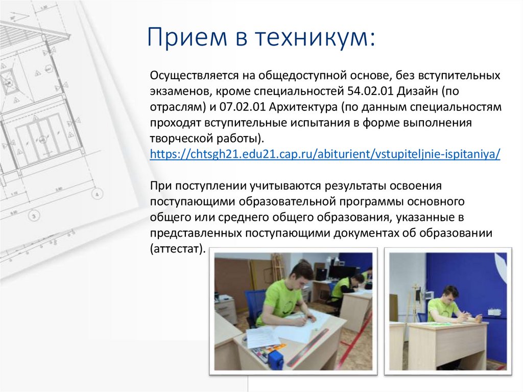Прием в техникум:Осуществляется на общедоступной основе, без вступительных