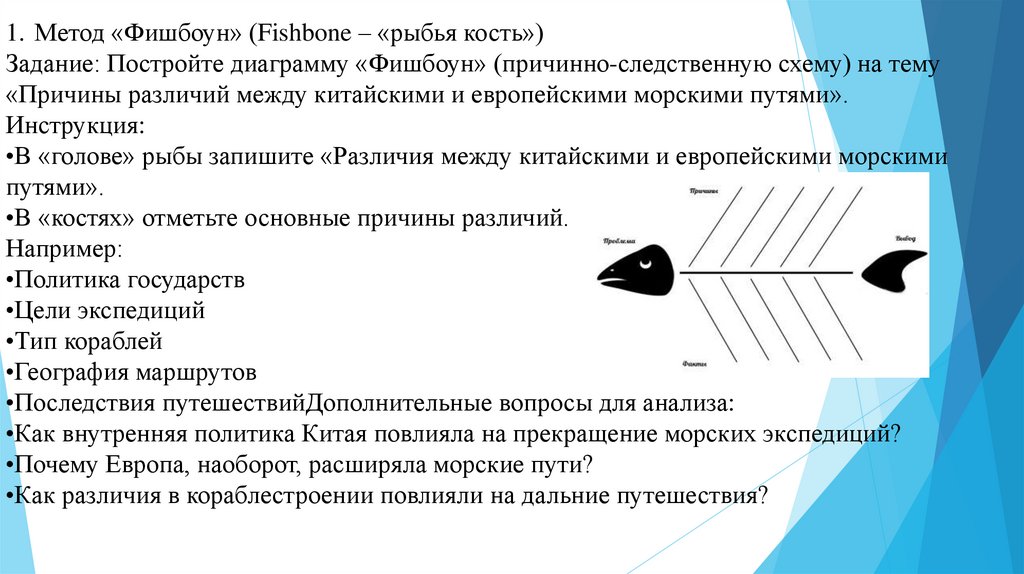1. Метод «Фишбоун» (Fishbone – «рыбья кость»)Задание: Постройте диаграмму «Фишбоун» (причинно-следственную схему) на тему