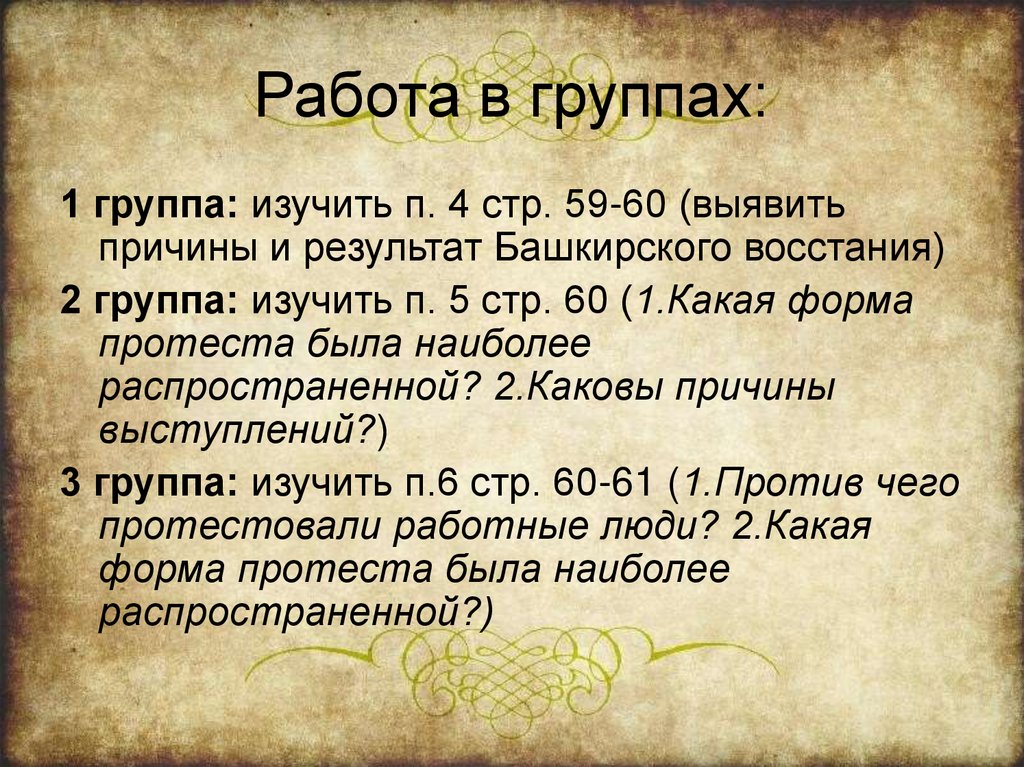 1 группа: изучить п. 4 стр. 59-60 (выявитьпричины и результат Башкирского восстания)