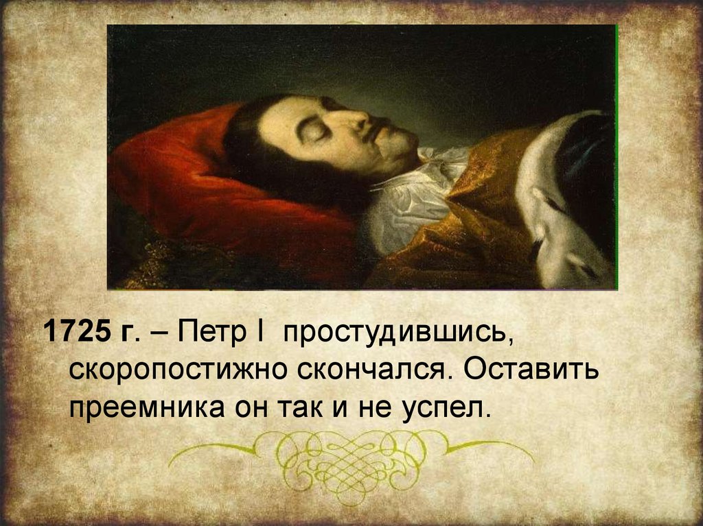 1725 г. – Петр I простудившись,скоропостижно скончался. Оставить