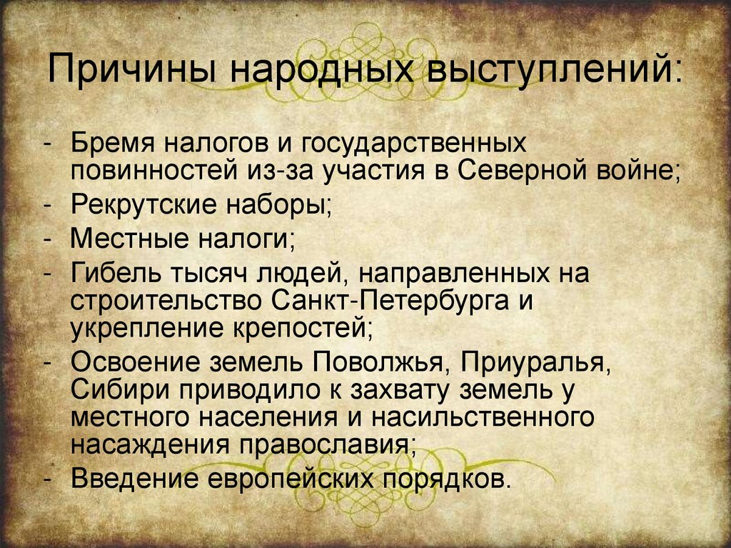 - Бремя налогов и государственныхповинностей из-за участия в Северной войне;