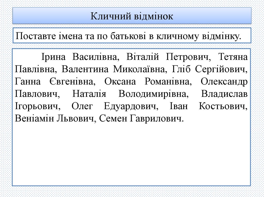 Кличний відмінокПоставте імена та по батькові в кличному відмінку.