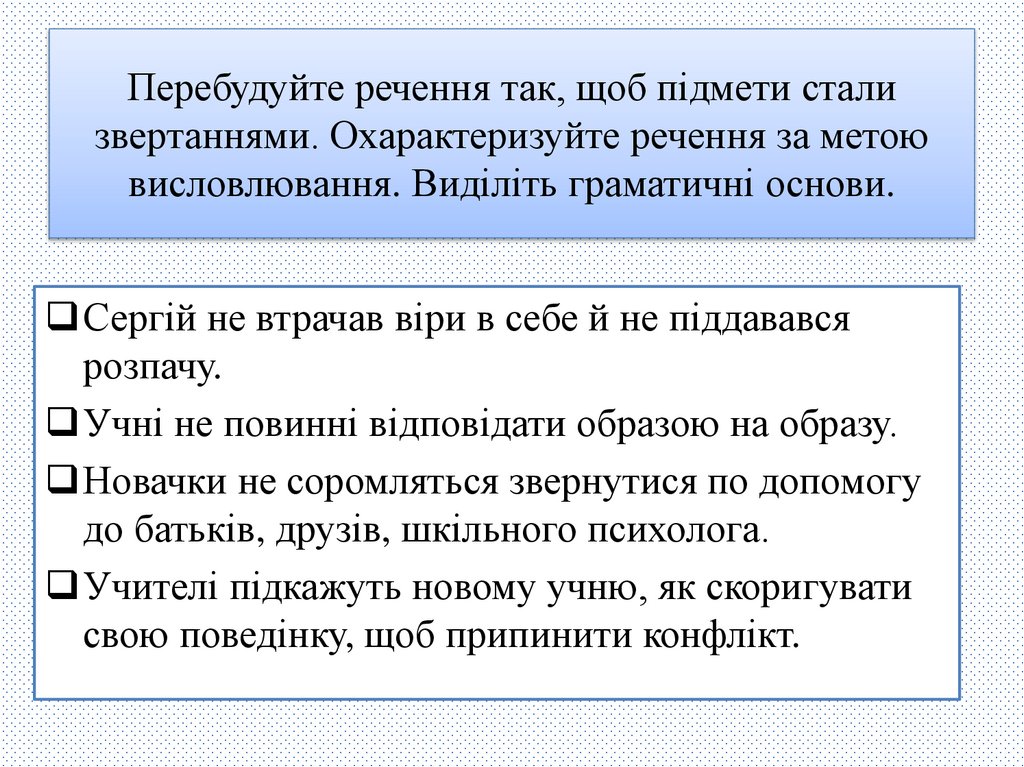 Перебудуйте речення так, щоб підмети стализвертаннями. Охарактеризуйте речення за метою