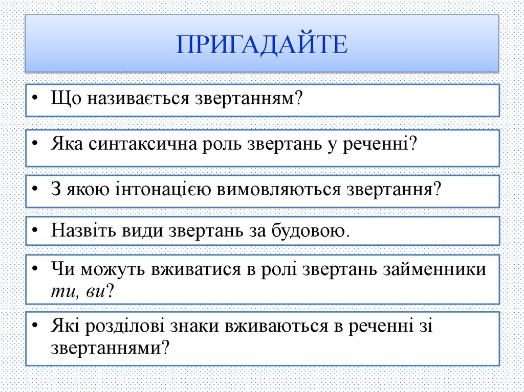 ПРИГАДАЙТЕ• Що називається звертанням?