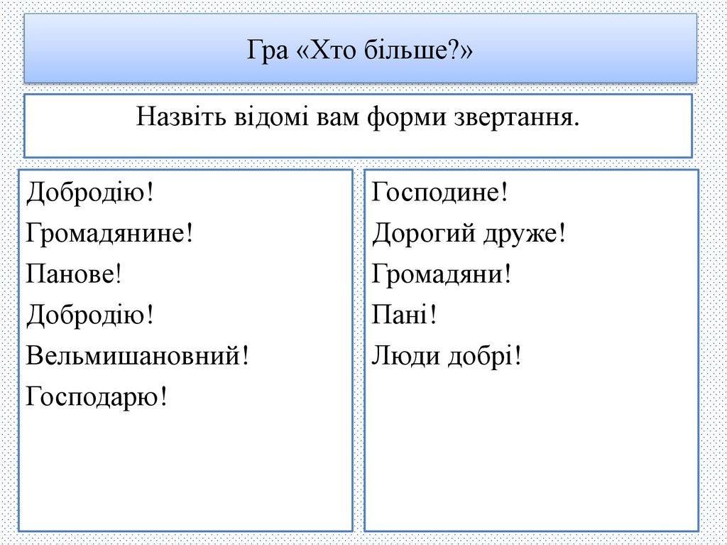 Гра «Хто більше?»Назвіть відомі вам форми звертання.