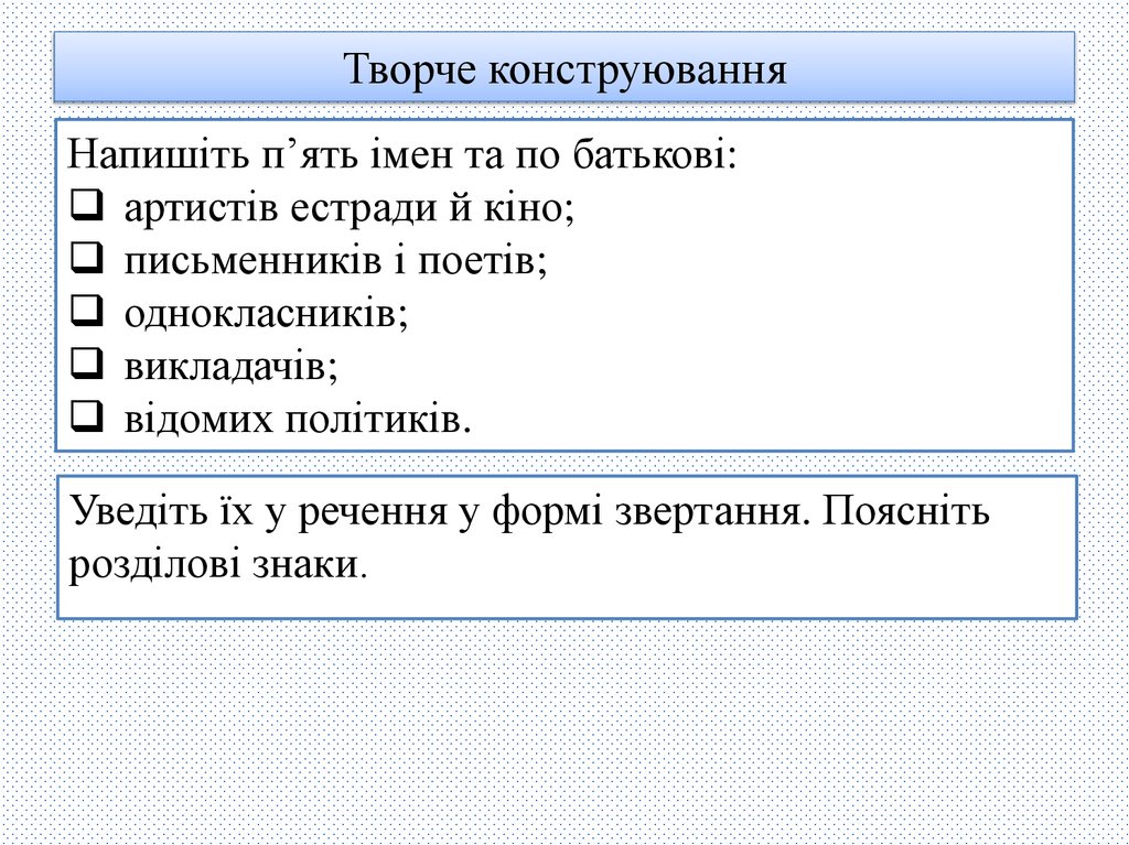 Творче конструюванняНапишіть п’ять імен та по батькові: