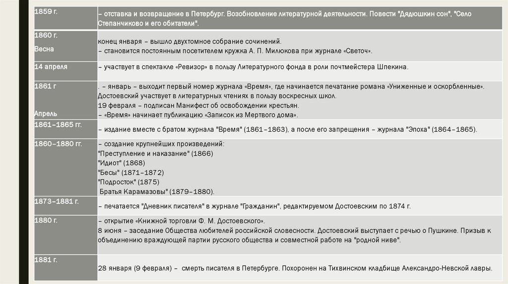 . – январь – выходит первый номер журнала «Время», где начинается печатание романа «Униженные и оскорбленные».