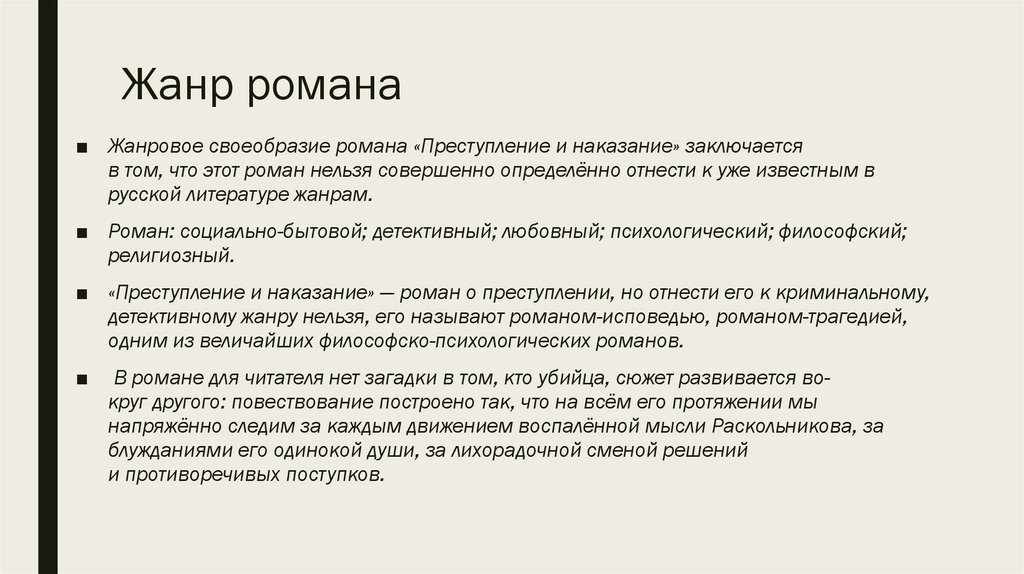■ Жанровое своеобразие романа «Преступление и наказание» заключаетсяв том, что этот роман нельзя совершенно определённо отнести к уже известным в