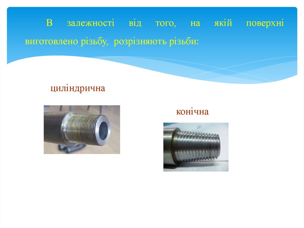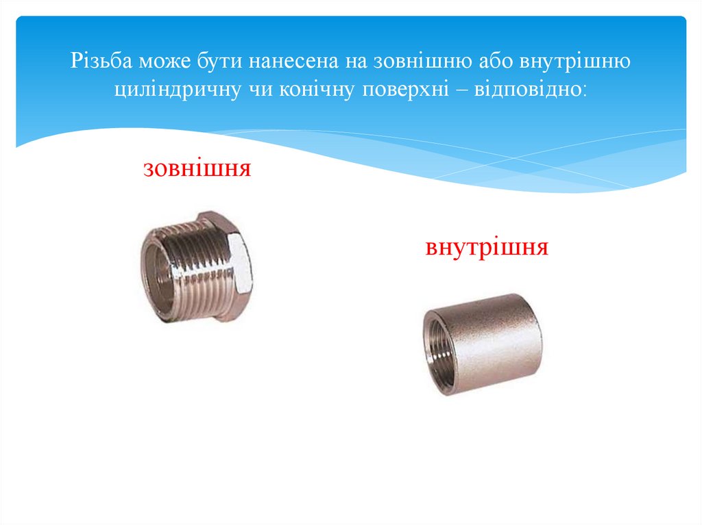 4. Різьба може бути нанесена на зовнішню або внутрішню циліндричну чи конічну поверхні – відповідно: