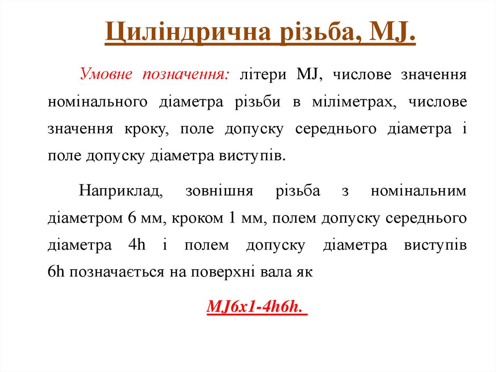 Умовне позначення: літери MJ, числове значенняномінального діаметра різьби в міліметрах, числове