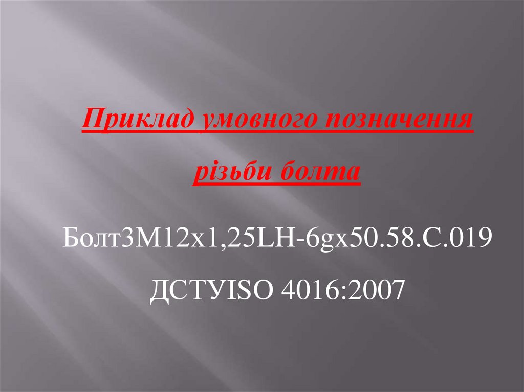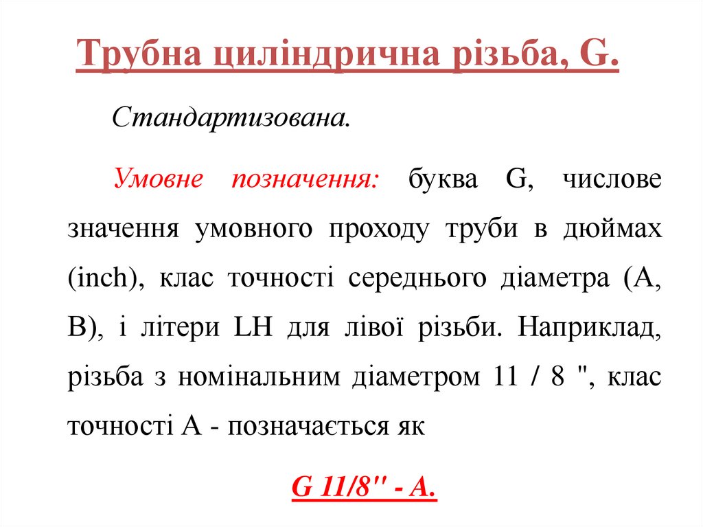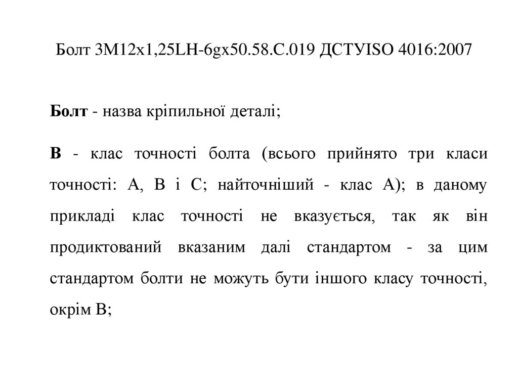6g - поле допуску різьби - визначає клас точностівиготовлення різьби (буває точний, середній, грубий клас позначається цифрами від 4 до 8 з латинськими літерами;