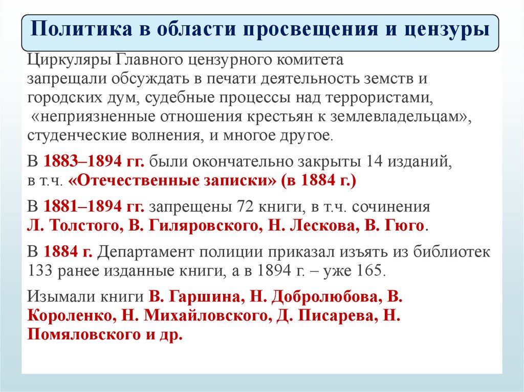 В 1881–1894 гг. запрещены 72 книги, в т.ч. сочинения