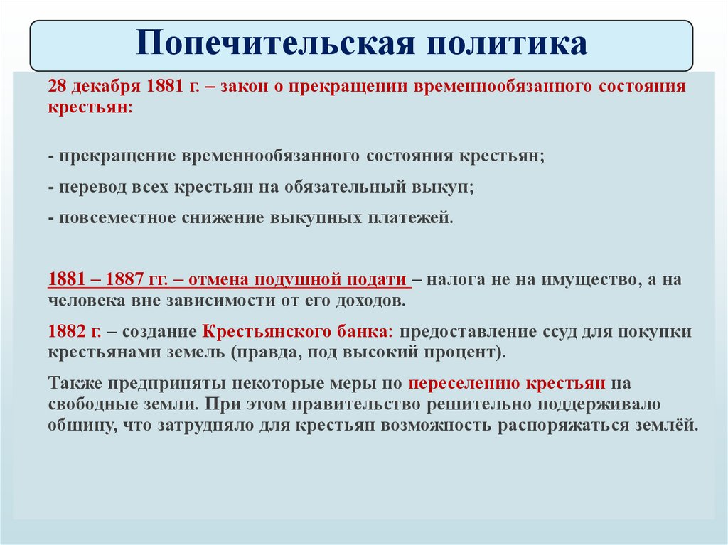 Попечительская политика28 декабря 1881 г. – закон о прекращении временнообязанного состояния