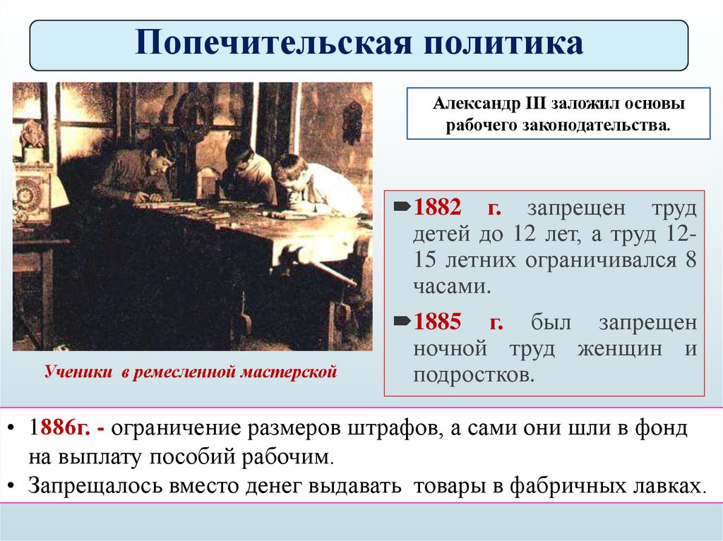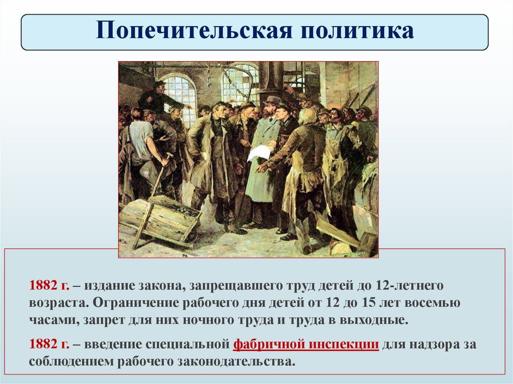 Попечительская политика1882 г. – издание закона, запрещавшего труд детей до 12-летнего