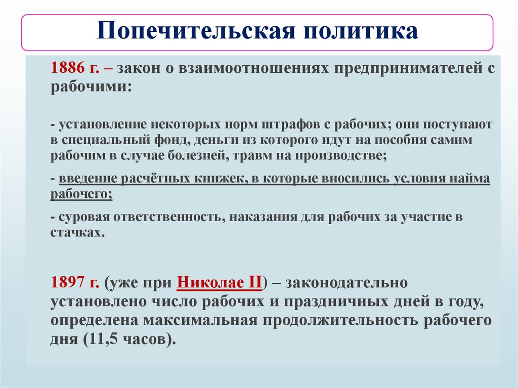 Попечительская политика1886 г. – закон о взаимоотношениях предпринимателей с