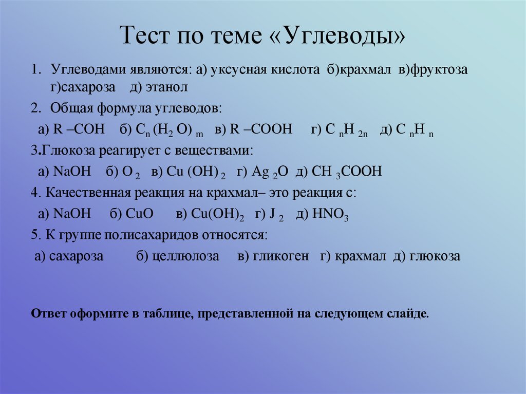 1. Углеводами являются: а) уксусная кислота б)крахмал в)фруктозаг)сахароза д) этанол