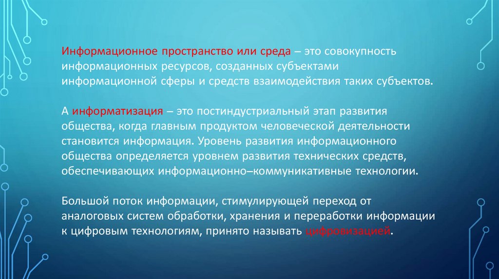 Информационное пространство или среда – это совокупностьинформационных ресурсов, созданных субъектами