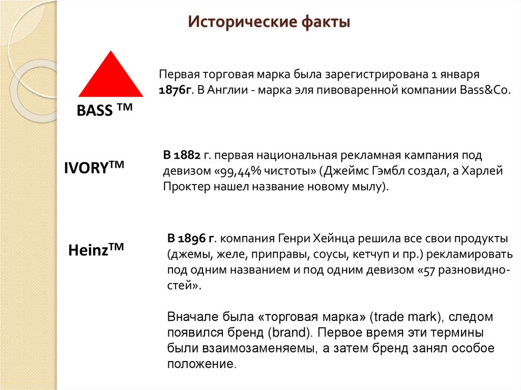Первая торговая марка была зарегистрирована 1 января1876г. В Англии - марка эля пивоваренной компании Bass&Co.