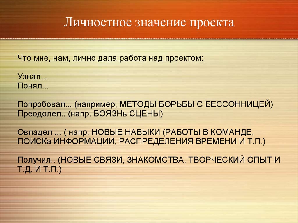 Личностное значение проектаЧто мне, нам, лично дала работа над проектом: