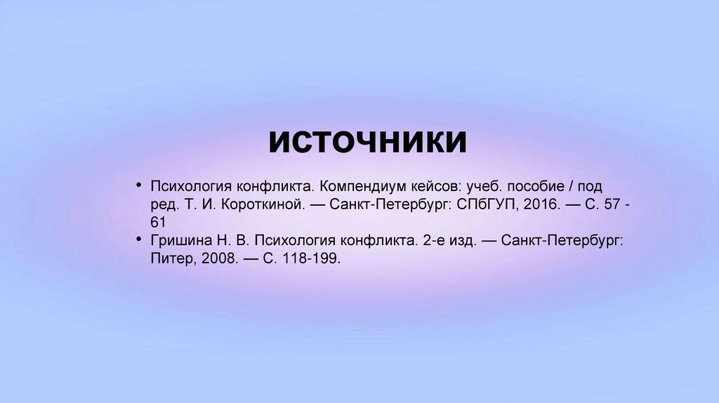 источники• Психология конфликта. Компендиум кейсов: учеб. пособие / под