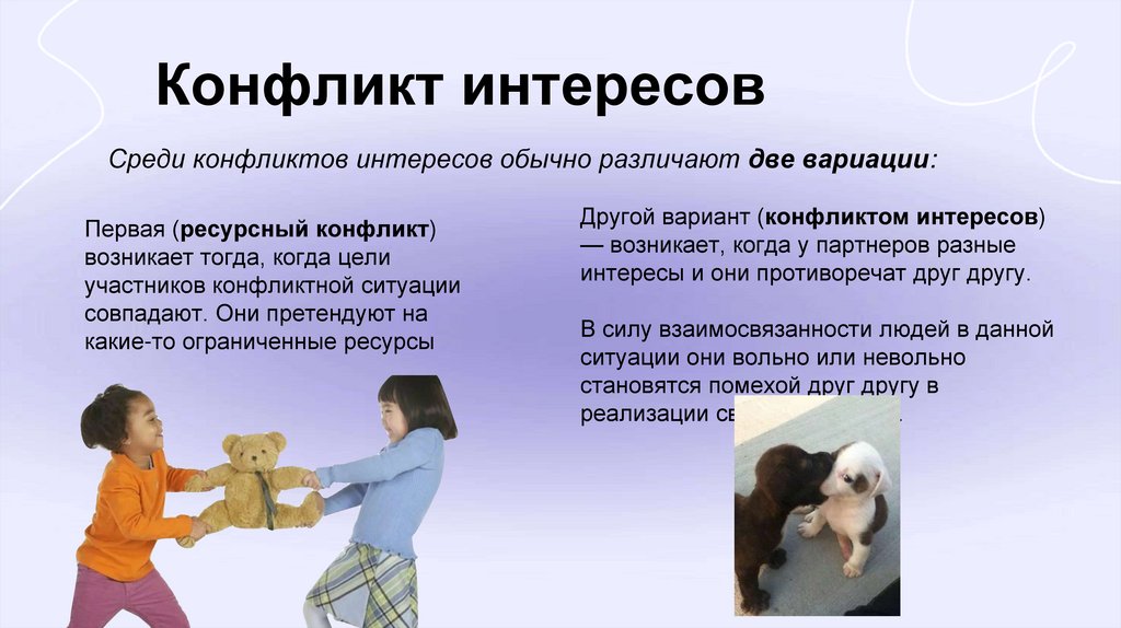 Конфликт интересовСреди конфликтов интересов обычно различают две вариации: