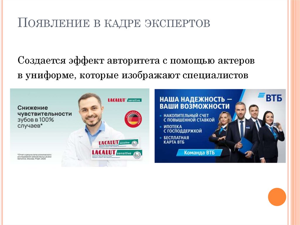 ПОЯВЛЕНИЕ В КАДРЕ ЭКСПЕРТОВСоздается эффект авторитета с помощью актеров
