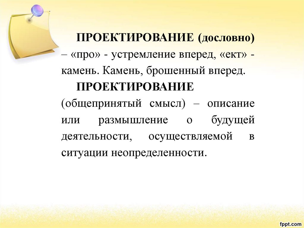 ПРОЕКТИРОВАНИЕ (дословно)– «про» - устремление вперед, «ект» камень. Камень, брошенный вперед.