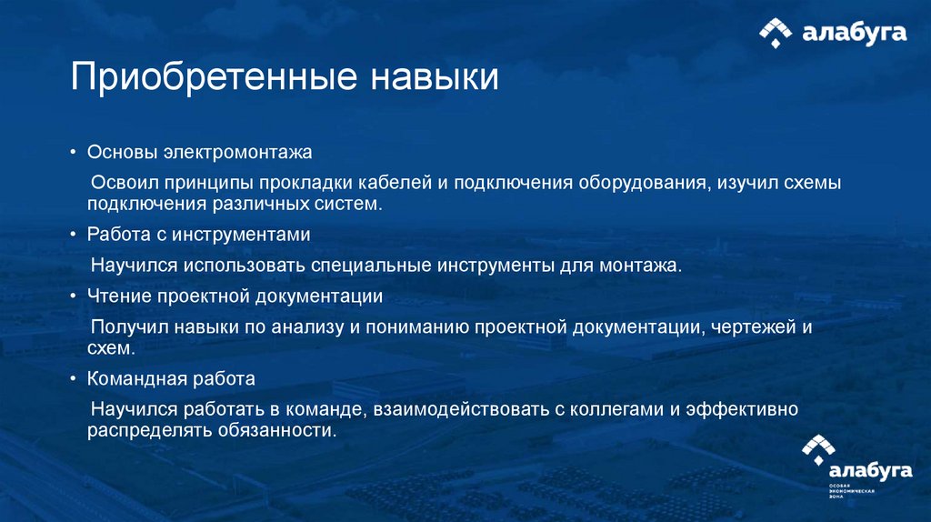 Приобретенные навыки• Основы электромонтажа