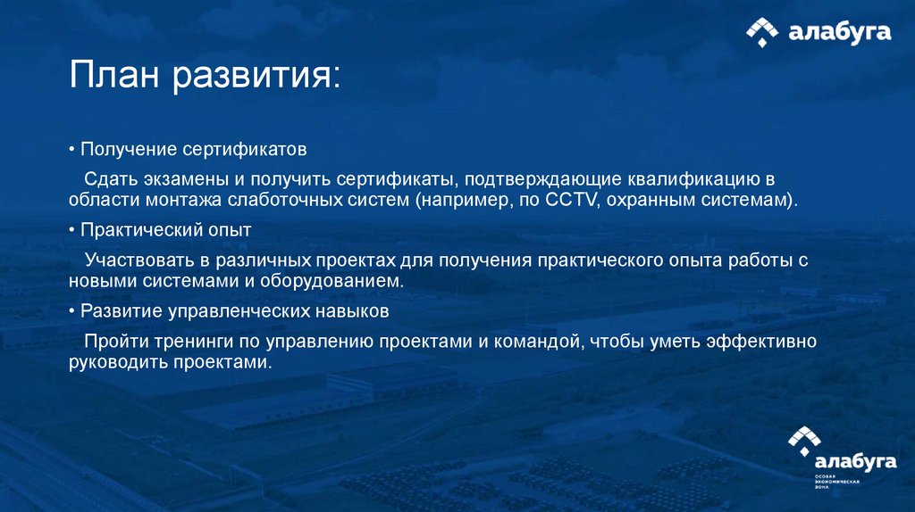План развития:• Получение сертификатов