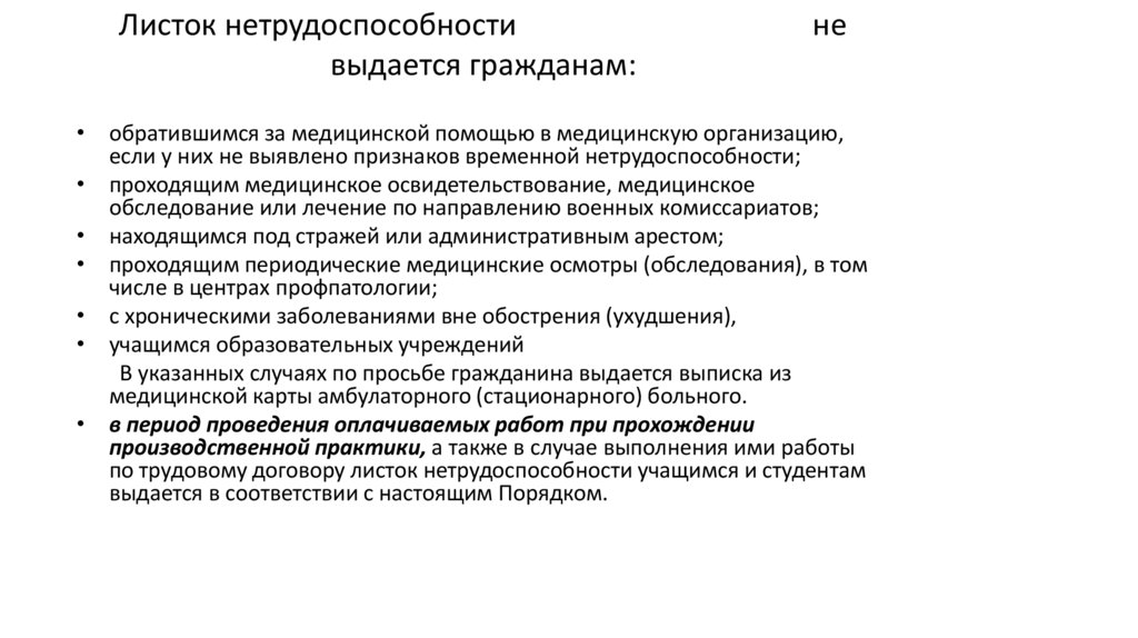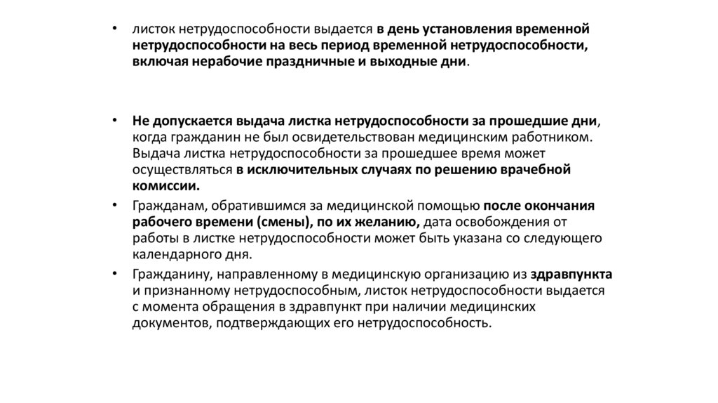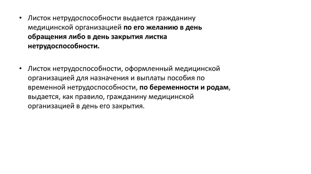 • Листок нетрудоспособности выдается гражданинумедицинской организацией по его желанию в день
