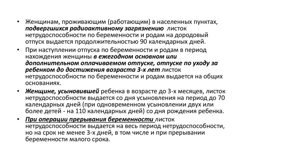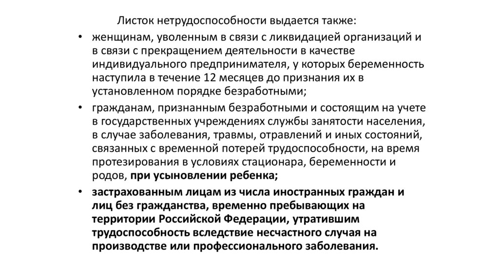 Листок нетрудоспособности выдается также:• женщинам, уволенным в связи с ликвидацией организаций и