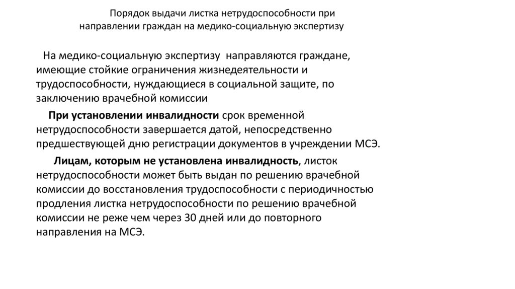 Порядок выдачи листка нетрудоспособности принаправлении граждан на медико-социальную экспертизу