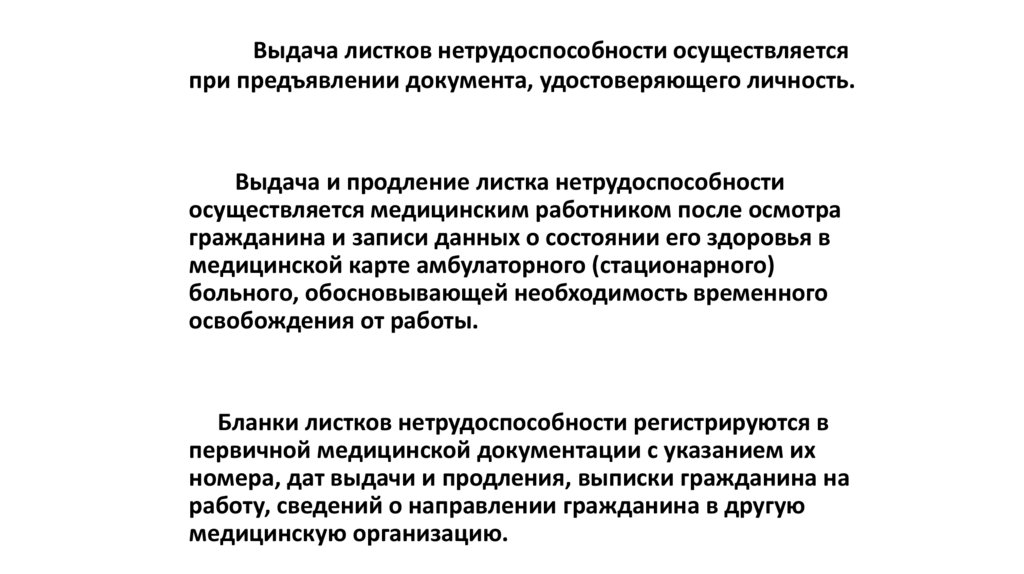 Выдача листков нетрудоспособности осуществляетсяпри предъявлении документа, удостоверяющего личность.