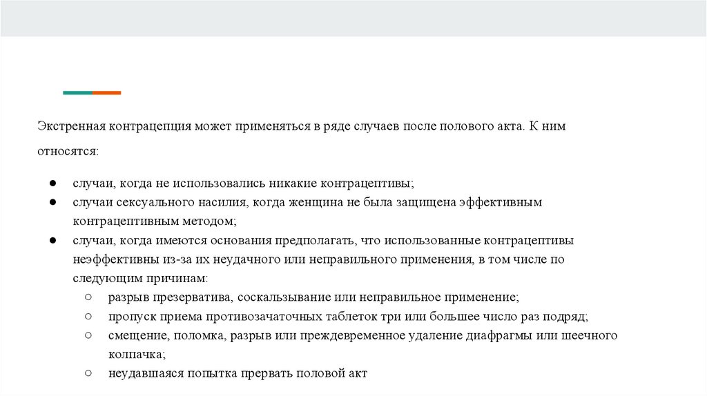 Экстренная контрацепция может применяться в ряде случаев после полового акта. К нимотносятся: