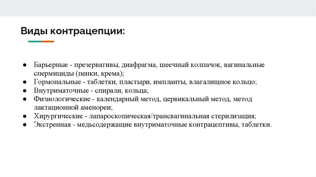 Виды контрацепции:● Барьерные - презервативы, диафрагма, шеечный колпачок, вагинальные
