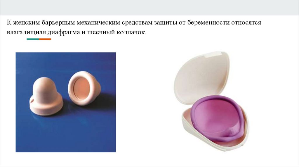 К женским барьерным механическим средствам защиты от беременности относятсявлагалищная диафрагма и шеечный колпачок.