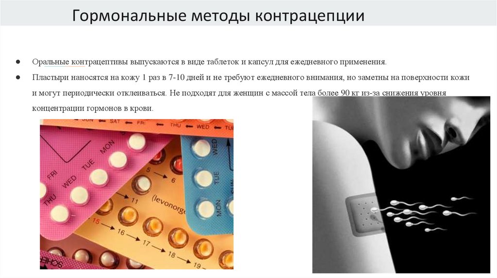 Гормональные методы контрацепцииОральные контрацептивы выпускаются в виде таблеток и капсул для ежедневного применения.