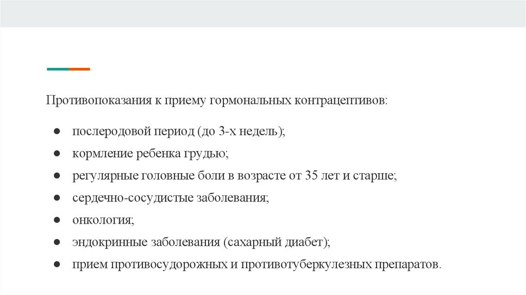 Противопоказания к приему гормональных контрацептивов:● послеродовой период (до 3-х недель);