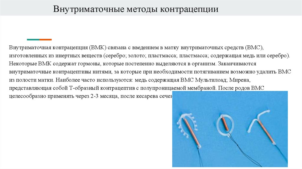 Внутриматочные методы контрацепцииВнутриматочная контрацепция (ВМК) связана с введением в матку внутриматочных средств (ВМС),