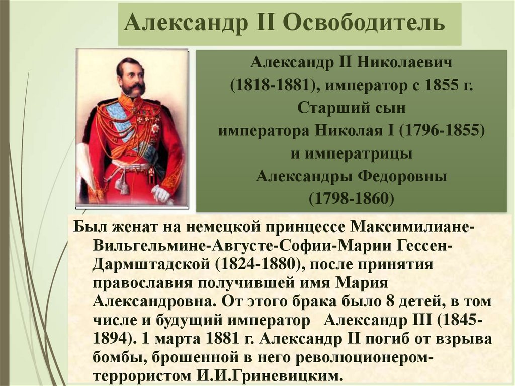 числе и будущий император Александр III (18451894). 1 марта 1881 г. Александр II погиб от взрыва