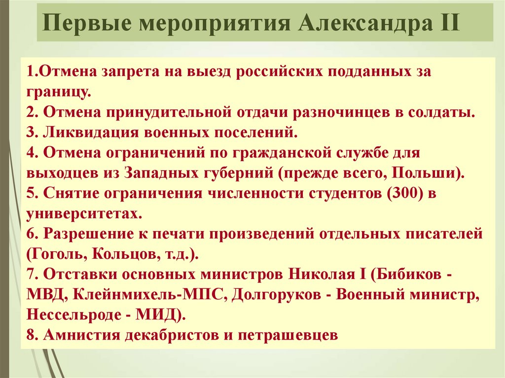7. Отставки основных министров Николая I (Бибиков МВД, Клейнмихель-МПС, Долгоруков - Военный министр,