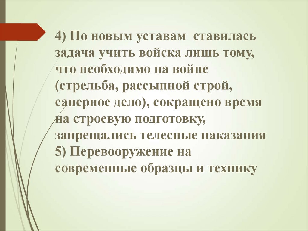 33. 4) По новым уставам ставилась задача учить войска лишь тому, что необходимо на войне (стрельба, рассыпной строй, саперное