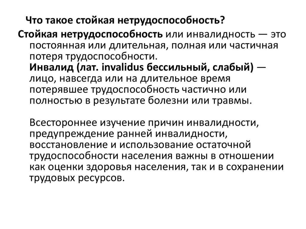 Что такое стойкая нетрудоспособность?Стойкая нетрудоспособность или инвалидность — это